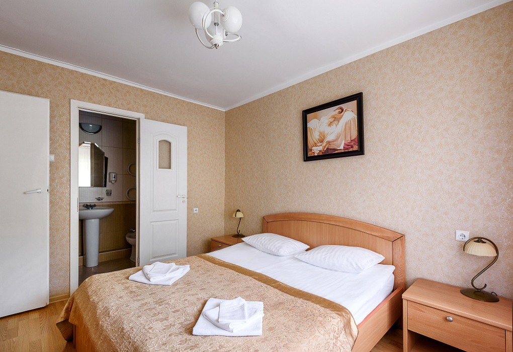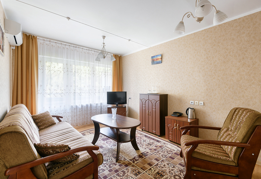 Площадь номера - 30 кв.м. 2 комнаты. 2 осн. места. Номер может располагаться в 1 или 2 корпусе со 2-ого по 8-ой этаж.. В номере: холодильник; лоджия; кондиционер; умывальник; туалет; биде; фен; электрочайник; сейф; туалетные принадлежности; 2-спальная кровать; душевая кабина; ЖК телевизор. 1 доп. место: Раскладной диван - может быть установлен без ограничения по возрасту.